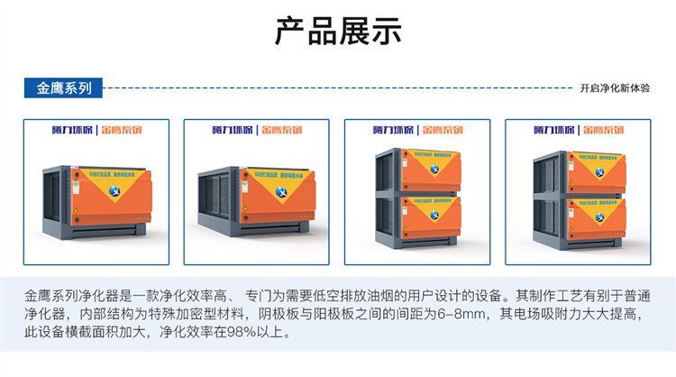 【金鷹系列臥式型凈化器】金鷹系列凈化器是一款凈化效率高、專門為需要低空排放油煙的用戶設(shè)計(jì)的設(shè)備。其制作工藝有別于普通凈化器,內(nèi)部結(jié)構(gòu)為特殊加密型材料,陰極板與陽極板之間的間距為6- -8mm,其電場吸附力大大提高,此設(shè)備橫截面積加大,凈化效率在98%以上。